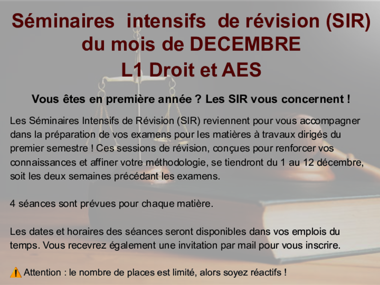 Les Séminaires Intensifs de Révision (SIR) reviennent pour vous accompagner dans la préparation de vos examens pour les matières à travaux dirigés du 1er semestre !